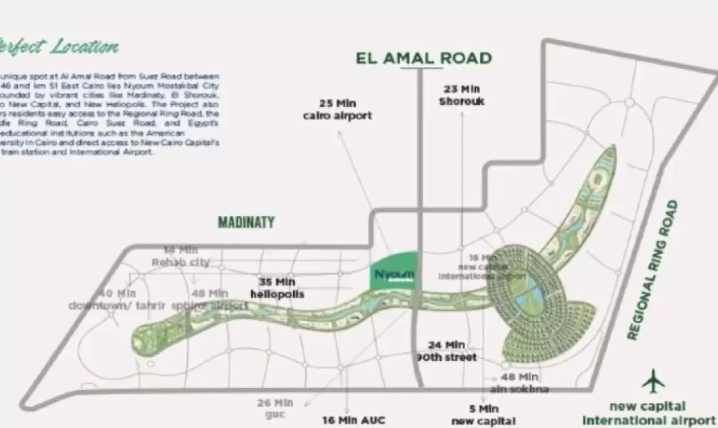 - يبُعد Compound Nyoum Mostakbal City عن الجامعة الأمريكية بحوالي 5 دقائق.
